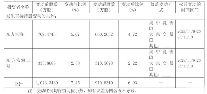其中,2025年11月6日至2025年11月13日,东方富海及东方富海二号通过集中竞价方式合计减持公司股份725,120股,所持有公司股份数量由10,433,430股减少至9,708,310股,占公司总股本的比例由7.45%减少至6.93%,减持了0.52个百分点。