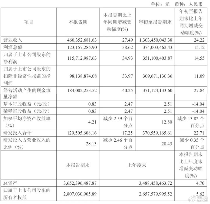 9个月营收13亿净利3.5亿
